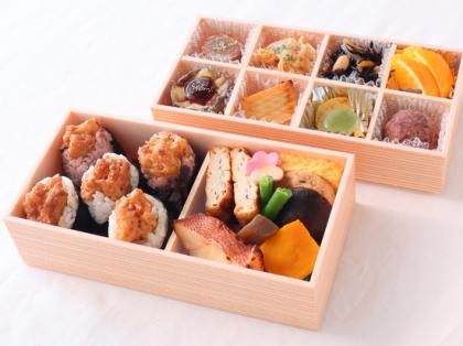 | 天むす3個 黒米天むす2個 赤魚西京焼 豆腐ハンバーグ 厚焼玉子 煮物(椎茸・がんもどき・こんにゃく・かぼちゃ・飾り麩) 牛肉ごぼう巻 海鮮焼売 ひじき煮 茄子はさみ揚げ イカ照り焼 あわ麩 木の芽味噌かけ インゲン きゃらぶき(蕗の佃煮) おはぎ オレンジ |