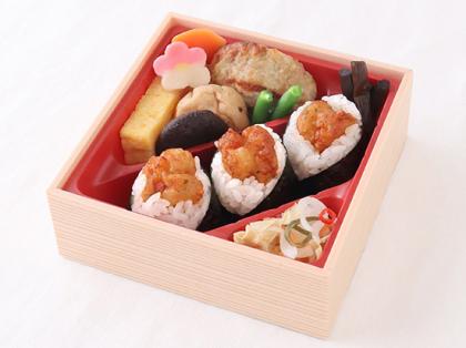 | 天むす3個 炭火焼鶏つくね 厚焼玉子 煮物(椎茸・がんもどき・にんじん・飾り麩) なますの湯葉山椒和え インゲン きゃらぶき(蕗の佃煮) |